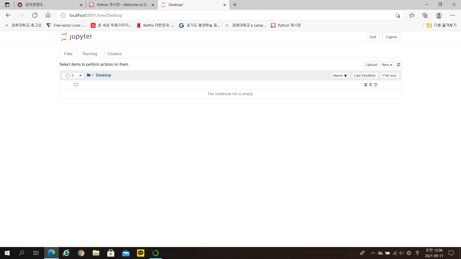 #python #anaconda #jupyter-notebook #visual-code #html #css #javascript #http 제목파일 업로드 관련 질문입니다.2021-09-11 00:11작성자ㅇㅇ제가 2021-2H-WebPython파일을 다운 받고 바탕화면에 저장을 했습니다. 그런데 다음 사진과 같이 데스크탑 폴더에 파일이 업로드 되어야 되는데 업로드가 안되어 있어서 문의드립니다. 목록수정삭제답변글쓰기 댓글 [0] 댓글작성자(*)비밀번호(*)내용(*) 댓글 등록 더보기이전[re]아나콘다 네비게이터와 주피터 노트북이 실행되지 않습니다조교 김승훈2021-09-14다음[re]파일 업로드 관련 질문입니다.조교 전현진2021-09-11 Powered by MangBoard | 망보드 스토어